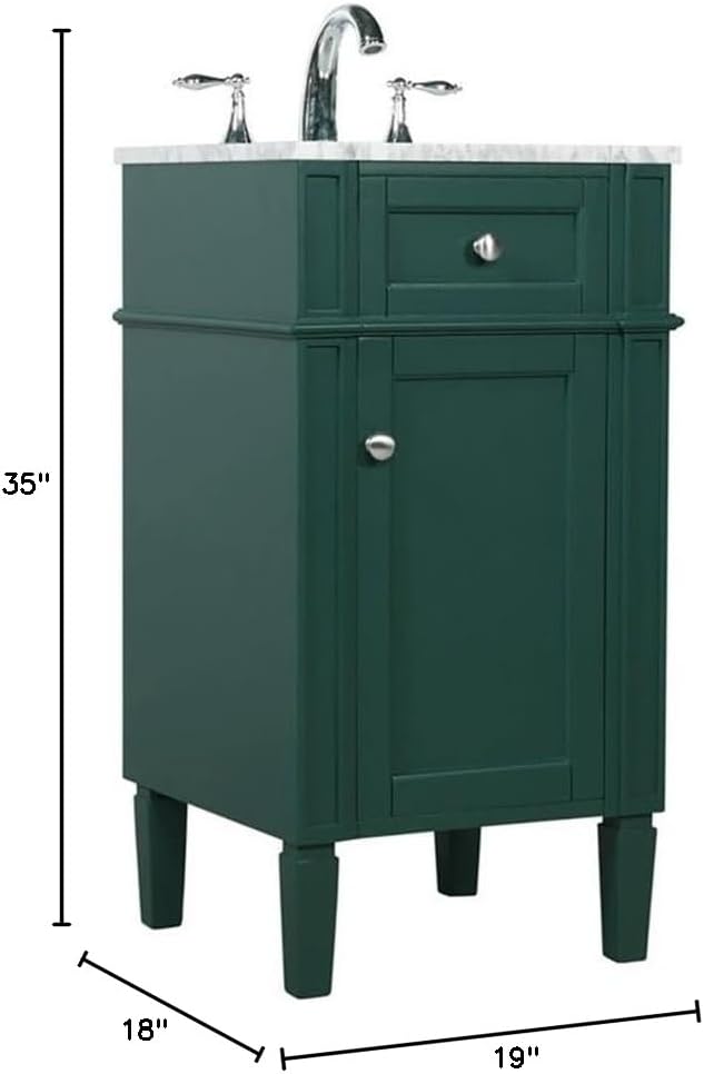 From its carrara white marble top to its contemporary style hand painted cabinet, it is sure to update your bathroom. Beneath its lustrous, natural stone marble top is an oval, white porcelain under-mount sink, removable shelf, for storing all your bathroom essentials.Features:- Materials: Metal, Solid wood, MDF, marble, porcelain- Finish: Green- Comes with an undermount porcelain sink and a carrara white marble countertop- Countertops are predrilled with 3 holes to accommodate a variety of faucets ( faucets are not included)- Designed with soft closing door- Built with a removable shelf, perfect to store your bathroom essentials- Hand painted finish application- Rectangle shapeSpecifications:- Product Dimensions: 35"H x 18"W x 19"D- Product Weight: 62 lbs- Warranty: 1 year limited- Product Dimensions: (Countertop) 18"L x 19"W x 0.7"H- Product Weight: (Countertop) 17.16 lbs- Product Dimensions: (Sink) 7.5"H x 12.88"W x 10.63"D- Product Dimensions: (Sink Drain hole) 1.75"- Product Dimensions: (Faucet hole) 1.36"- Number of Shelves: 1- Shelf Dimensions: 11.5"W x 14"D- Product Dimensions: (Shelf thickness) 9.75"- Weight Capacity: (Shelf) 11 lbs- Number of Doors: 1- Product Dimensions: (Door Handle) 0.98"H x 1.18"W x 1.18"L- Cabinet Dimensions: (Interior) 19.75"H x 11.5"W x 18"D- Leg Dimensions: 6.63"H x 2"W x 2"D