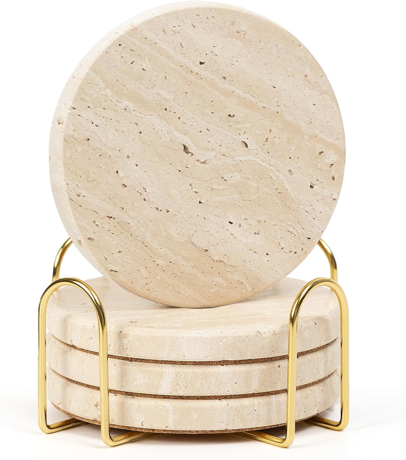 Elevate & Protect: YONGHEE 6-Pack Travertine Coasters with Holder Natural Stone Elegance This complete set of 6 stone coasters, along with a sleek gold metal holder, is crafted from authentic Travertino Romano. Each 4-inch round coaster is 0.4 inches thick and weighs around 6.4 oz, offering a premium feel. These naturally beautiful coasters feature unique porous textures and warm beige tones. Presented together, they create a striking and organized statement of organic style for your home. Worry-Free Protection Designed for confidence, the solid stone offers reliable thermal insulation, while the cork base ensures stability, prevents slips, and defends against scratches. The natural porosity manages light moisture to shield your furniture from water rings. Ideal for daily use indoors or outside. Discover Your Perfect Match Material & Craft: Travertine Coasters Set of 6 with Holder, Natural Stone Coasters, Coasters with Cork Backing.Decor Style: Rustic Coasters, Farmhouse Coasters, Modern Coasters, Boho Coasters.Use For: Dining Table Coasters, Coffee Table Coasters, Bar Coasters, Desk Coasters.Key Feature: Non-Slip, Scratch Resistant, Heat Resistant, Durable, with Stand.Ideal Gift: Wedding Gift, Housewarming Gift, Hostess Gift, Anniversary Gift.The YONGHEE Essence More than coasters, this is an investment in timeless style and effortless care. We blend natural beauty with purposeful design to deliver both utility and elegance, presented in a ready-to-gift box.